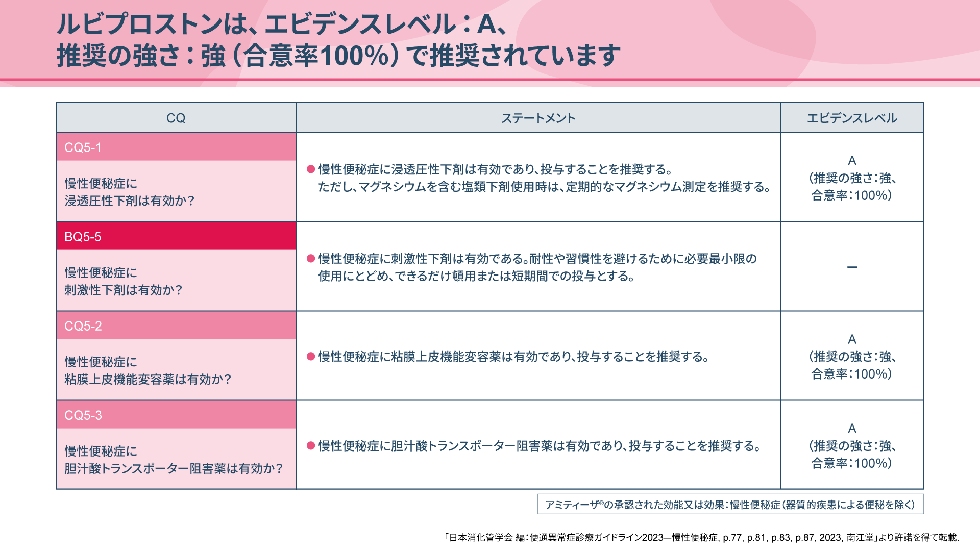 アミティーザ®(ルビプロストン)は、『便通異常症診療ガイドライン2023—慢性便秘症』において、浸透圧性下剤、胆汁酸トランスポーター阻害薬と並んでエビデンスレベル:Aで推奨されています。