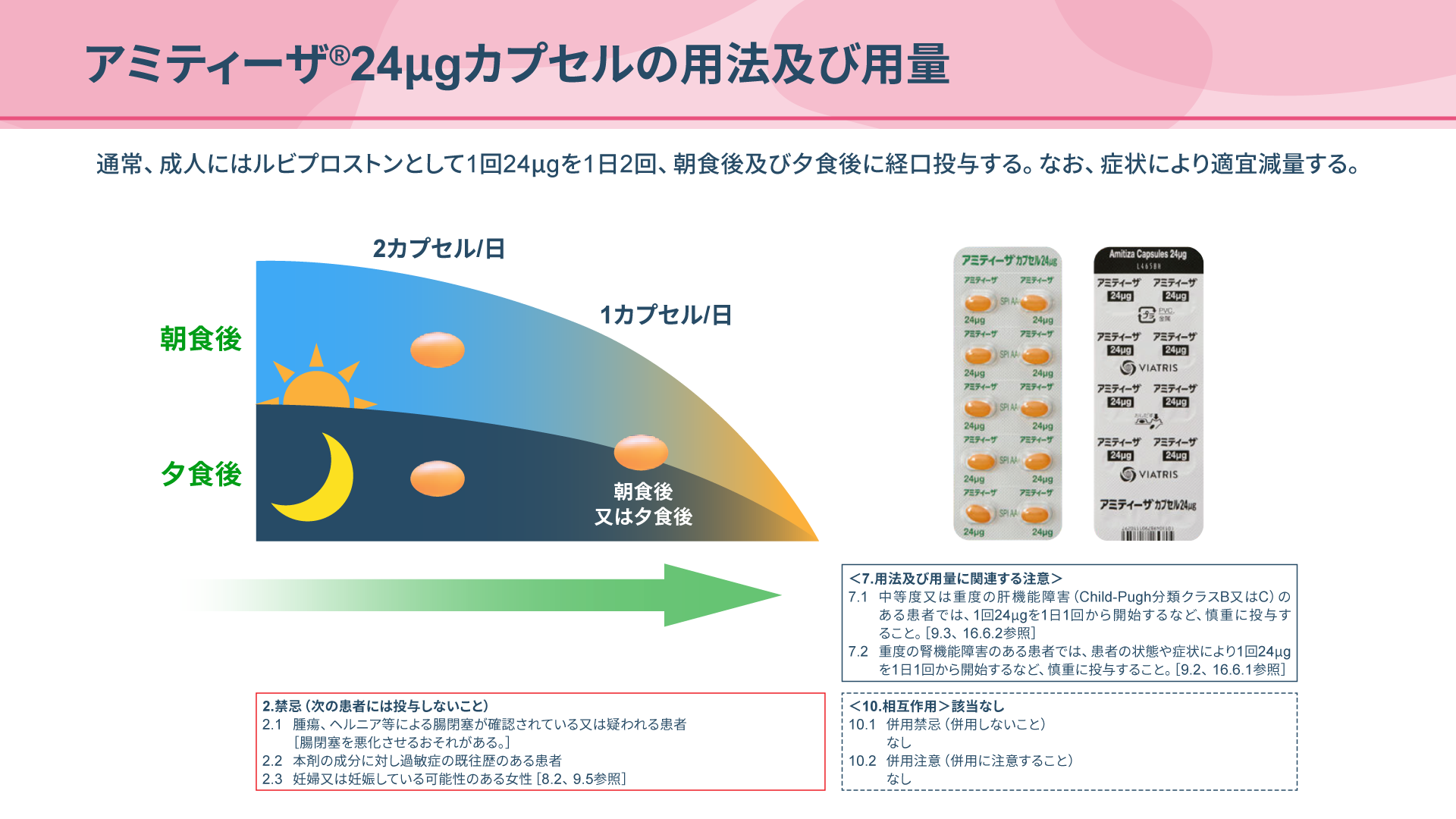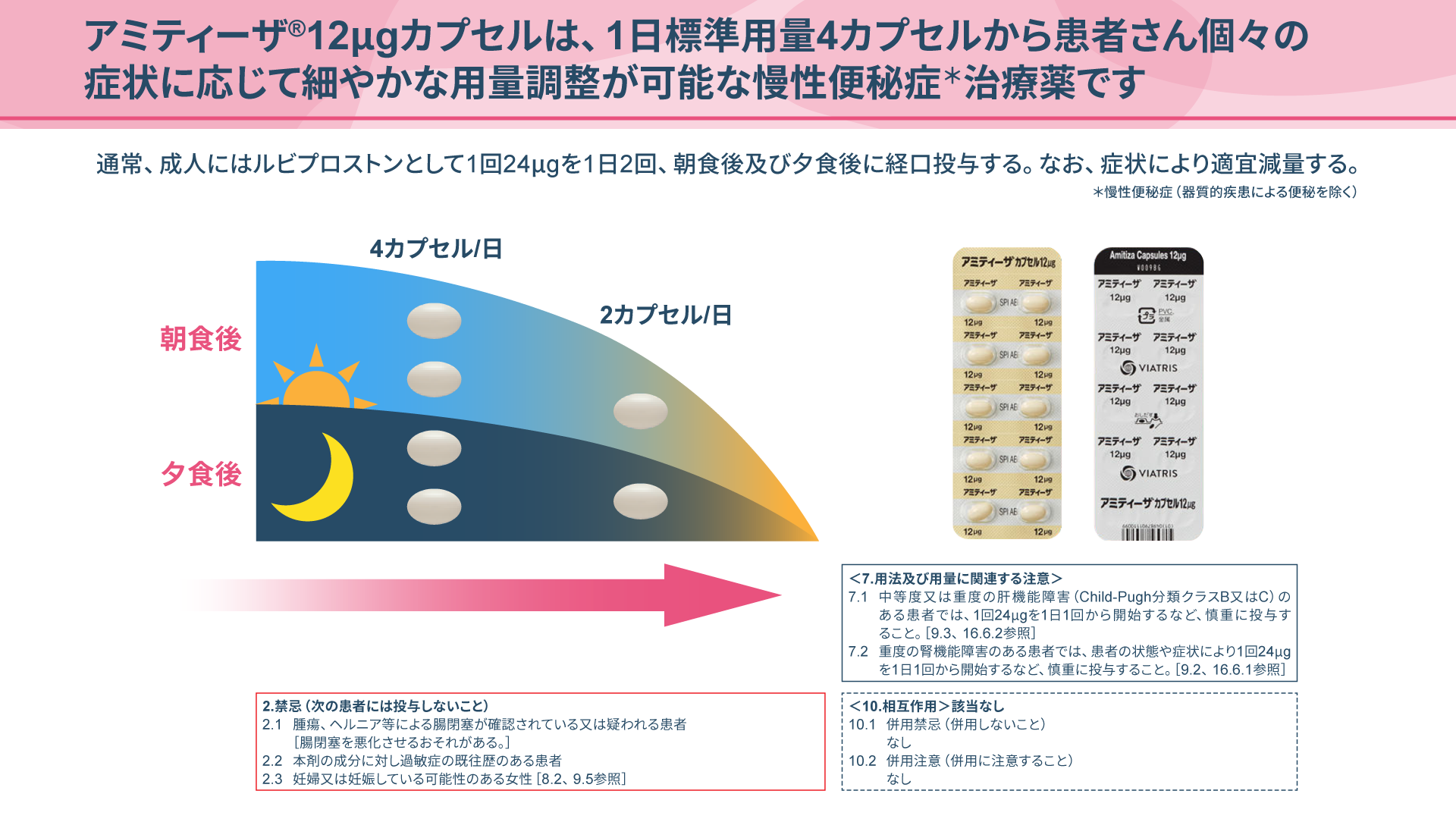 アミティーザ®12μgカプセルは、通常、成人には1回2カプセルを1日2回、朝食後及び夕食後に経口投与し、症状により適宜減量してご使用いただけます。