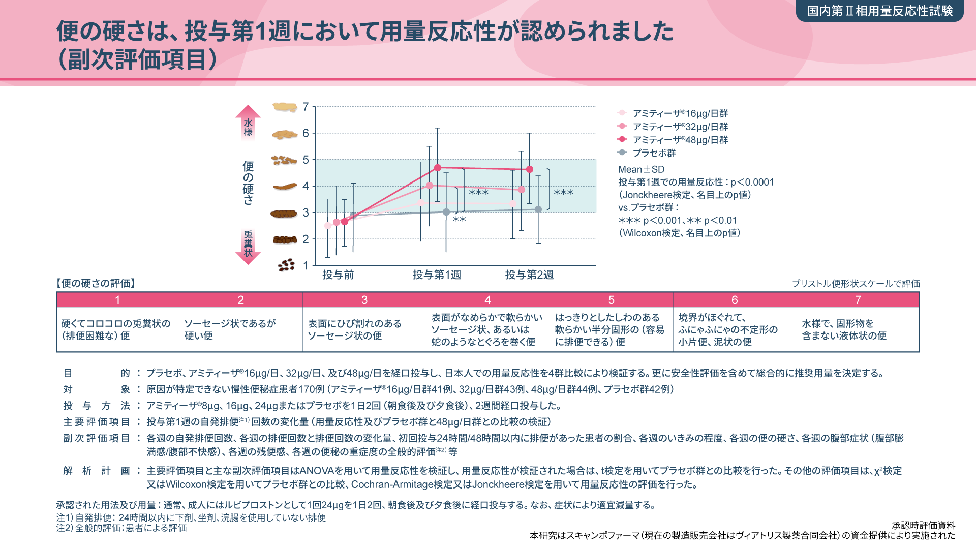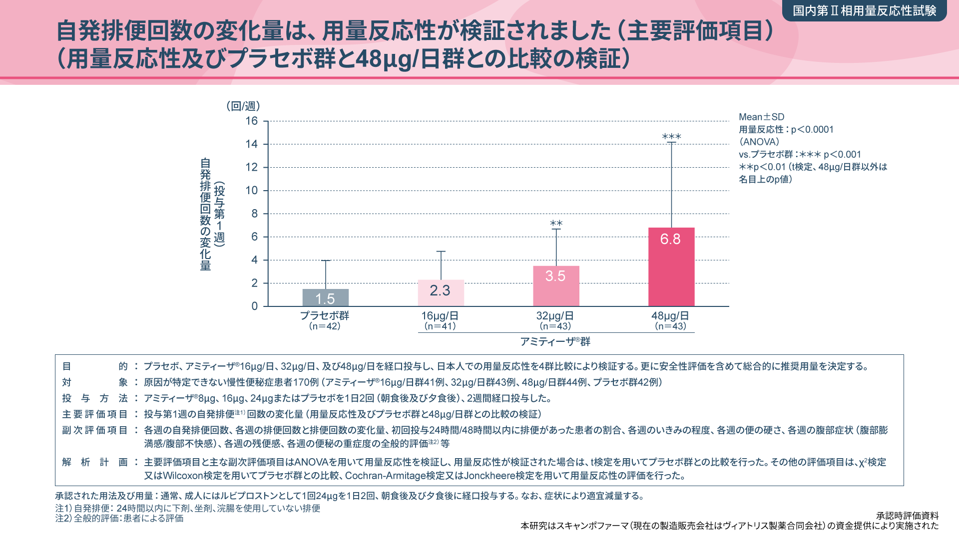 本試験の主要評価項目である「投与第1週の自発排便回数の変化量」について、アミティーザ®16μg/日群が2.3回/週、32μg/日群が3.5回/週、48μg/日群が6.8回/週であり、用量反応性が検証されました。
