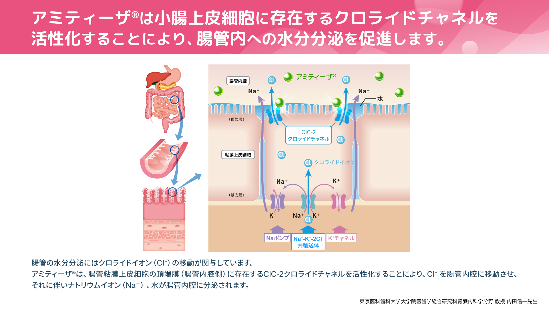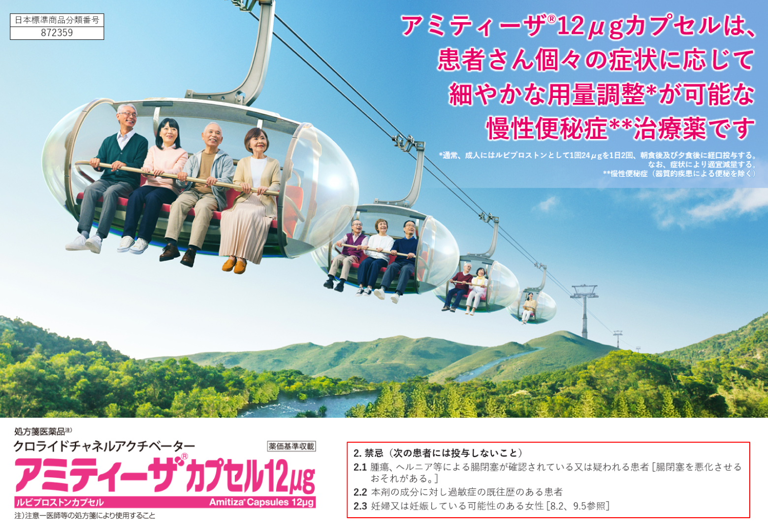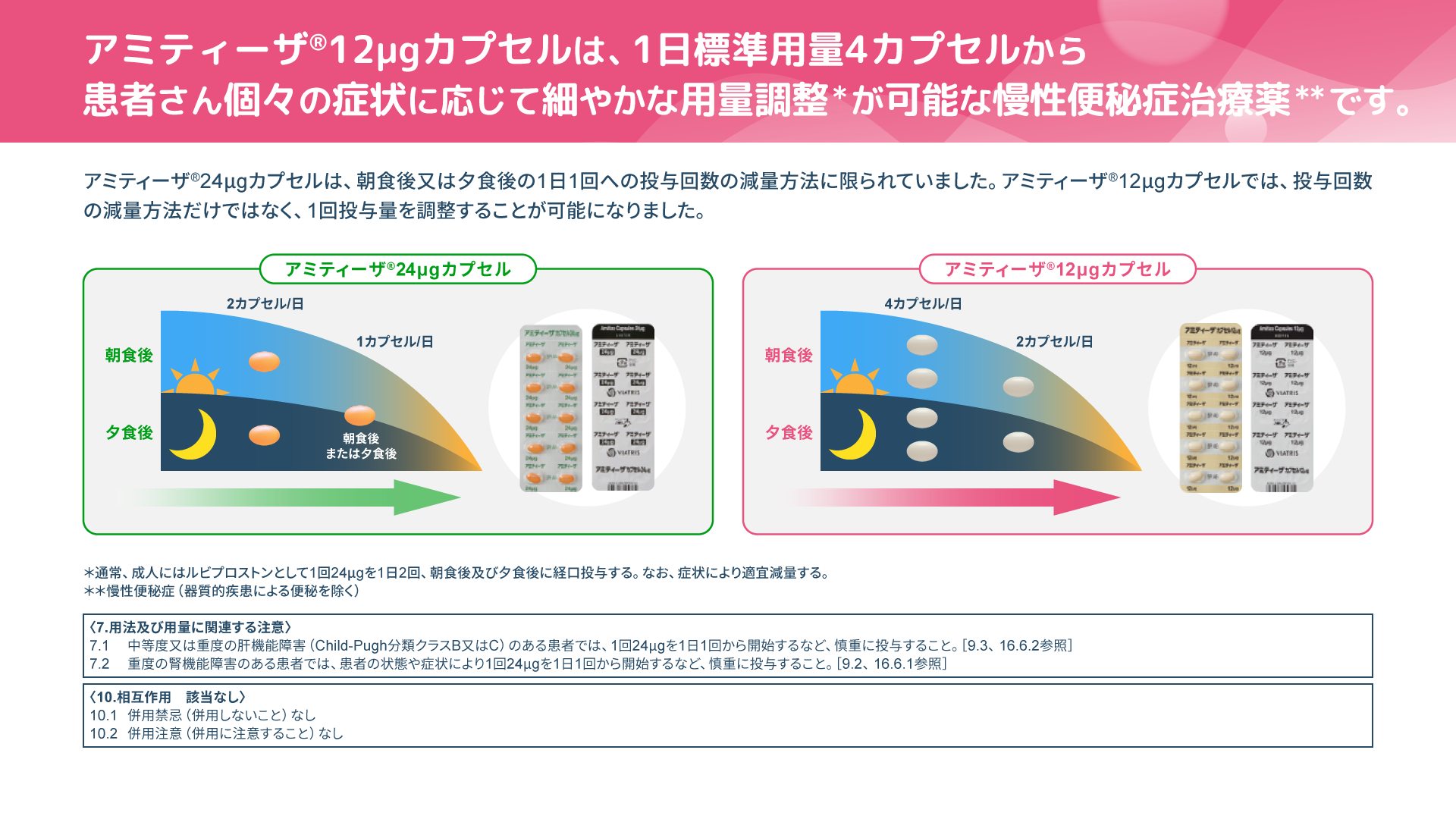 慢性便秘症患者さんに対し、アミティーザ®24μgカプセル1日2回が処方されている。