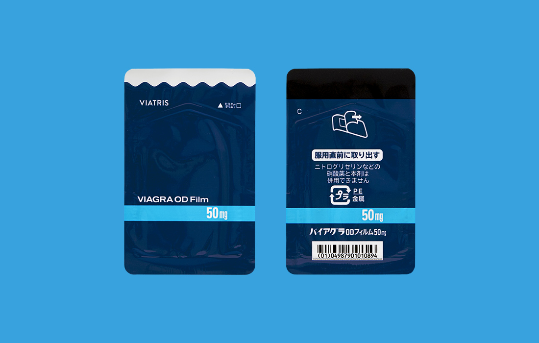 - 服用性が高く患者の QOL 改善に貢献できる製剤として、口腔内崩壊フィルム製剤が開発されました。バイアグラODフィルムはヒトを対象とした臨床試験で、品質及び生物学的同等性が確認され、バイアグラ錠と同一の効能又は効果、用法及び用量で承認されました。 1)